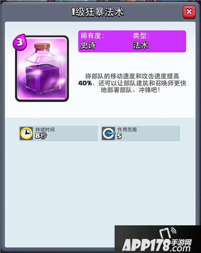 狂暴法术类似于兴奋剂,大范围提升单位的攻速和移速,包括建筑物的攻速和所有单位的部署时间,9秒的持续时间非常明显,但是也略鸡肋,必须保证9秒内范围内的尽可能多的单位存活并且开始输出才有最大收益,非常讲究配合和操作,否则就是白送3费的节奏,新手玩家玩玩不擅于驾驭狂暴法术,在对方及时消灭进攻部队的时候很难有作为,很多时候需要额外的费用支持和很好的保护和时机把握。