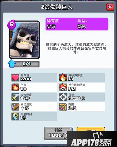 骷髅巨人最近经历了一次改动,平砍伤害略有提高,死亡之后炸弹爆炸时间由1秒改为3秒,总体上来说是削弱了。骷髅巨人原本就是半肉低输出依靠爆炸伤害消灭部队和建筑的角色,这次改动让骷髅巨人死亡爆炸伤害更难消灭行进迅速的单位,提升了平砍伤害明显反映了设计师希望骷髅巨人更加需要技巧行进和受到适当保护才能造成巨大威胁的意图。总体上来说,骷髅巨人的生命值较高,平砍伤害对付小单位尚可,部署时间短行进速度中等,死亡伤害非常惊人,在没有其他防御的情况下完全可以单独破掉一个公主塔,6费还是比较值的。
