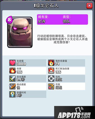 对于低阶玩家和低费用灵活性卡组,石头人一路的推进是碾压性的,很可能配合皇家塔,防守单位都无法很快地消灭石头人,一次爆炸伤害可以消灭附近的近战小单位,还有小石头的两次稍低伤害的爆炸,当然进攻方不可能只有石头人一个进攻点,配合后续输出和突击单位,防守艰难,大部分情况只有地狱塔和皮卡能够较为轻松地消灭石头人,当然配合建筑物风筝石头人也是不错的选择。