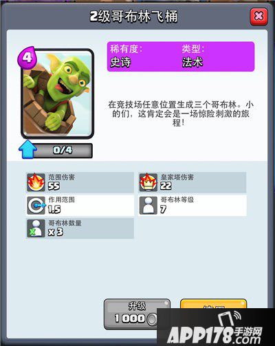 同样的我也把哥布林投掷桶定位为法术,相对于2费远程传送一队哥布林,是偷塔流的核心牌之一,在敌人猝不及防的情况下很容易大量消磨皇家塔血量,哥布林本身的攻击力很高,但碍于血量偏低在行进过程中容易受到远程伤害团灭,但是投掷桶直接传送进行零距离攻击,让哥布林的输出达到最大限度。投掷桶本身的伤害可以忽略不计,哥布林3人组落地之后又一个短暂的延迟才开始攻击,所以给了对手秒解的机会,大部分是用法术秒解,哥布林投掷桶锁定公主塔投掷落地后3个哥布林是三角形站位的,所以机会无法用士兵秒解,所以电击、箭雨和火球是常见的选择,于是也出现了故意丢偏投掷桶骗法术的战。不过总体上还是锁定皇家塔三角站位比较稳定,当然可以多次投掷之后插入一次偏斜投掷,打对手一个措手不及。
