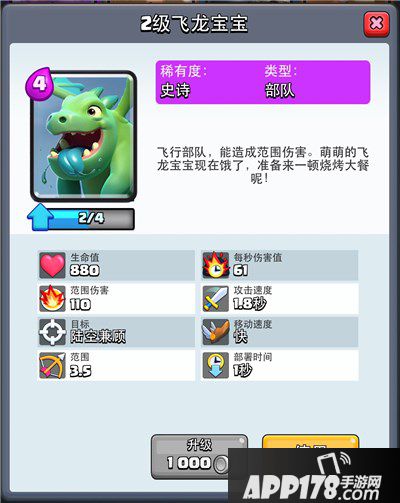 飞龙宝宝也是一张A0能够解锁的强力紫卡,对于低阶新手防空手段不足可以造成巨大威胁,可以定位为空中坦克,作为飞行单位兼具群攻能力,单次伤害能够秒杀哥布林投矛手,两次攻击可以消灭哥布林和亡灵,是群体小单位的克星,同时过河之后可以吸收伤害让进攻单位更好的输出。
