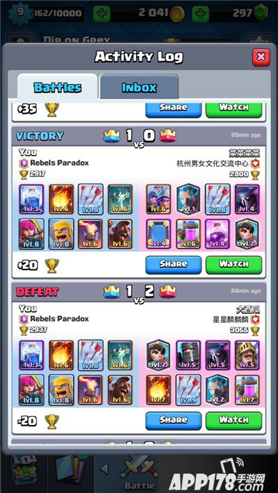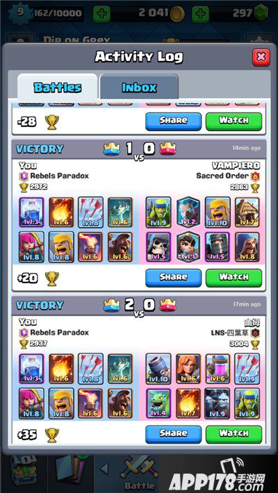 这套卡组总的进攻思路就是:野猪争取摸塔,弓箭手蹭塔血,其它时候专心打防守反击,争取用兵能打掉搭1/3的血,其他的交给闪电和火球。