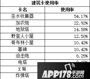 水瓶是使用率最高的建筑卡,小编另外有统计了一下,这48个样本中,在没有使用水瓶的情况下,卡组平均耗水3.82,而使用了水瓶的卡组,平均耗水上升到4.09,意味着可以多使用一张2-3费的卡牌,战斗时间拖得越长越有利。(实践证明,单独对水瓶使用火球、雷电、火箭等都是不划算的,尤其是水瓶的等级高了之后,因此大家都用水瓶会变成一个常态,除非你玩的是速攻。)