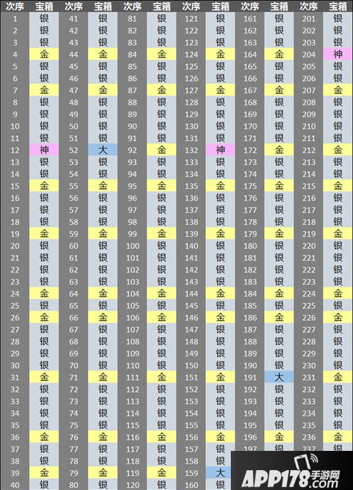答:宝箱掉落顺序图见下,240一轮,平均银箱子3/4,金箱子及以上1/4,大概每天平均开5个箱子PS:除了超级神奇宝箱目前看是0.1%随机掉落