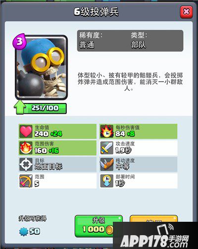 这卡跟公主一比,就知道多垃圾了,都是aoe,都是3费,都是攻击频率慢,但是投弹兵经常莫名其妙就死了。因为射程短,基本没人用的一张卡,也是跟法师,弓箭手 一样的问题,过河就是死, 被切后排瞬间死。