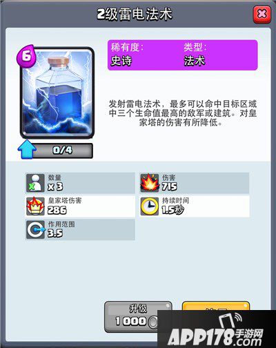 4.闪电可用于补塔刀,后期双倍时间甚至加时赛阶段,利用其他低费卡,快速刷出闪电,直接赢得比赛,这也是闪电最大的优势。但一定要牢记不同等级闪电对塔箭的伤害,例如三级闪电对箭塔造成315点伤害,忘记了也没关系,对战时也可以通过长按卡牌图标获知伤害数值。