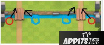 1.开局可以裸下,位于河道两侧,如下图红圈处,可避免一些置于黄金防守位建筑的吸引。作用试探对手卡组,过牌。