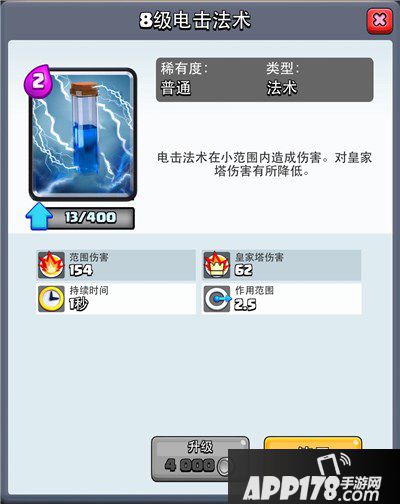 电击法术:二费的小法术。主要用处在于我们的野猪冲到塔下,对方扔下野蛮人哥布林 六个核桃一类的,直接放下。 会有一秒加的眩晕效果,使我们的野猪可能打出更多的伤害。也可用作防守,解决六个核桃 哥布林等。