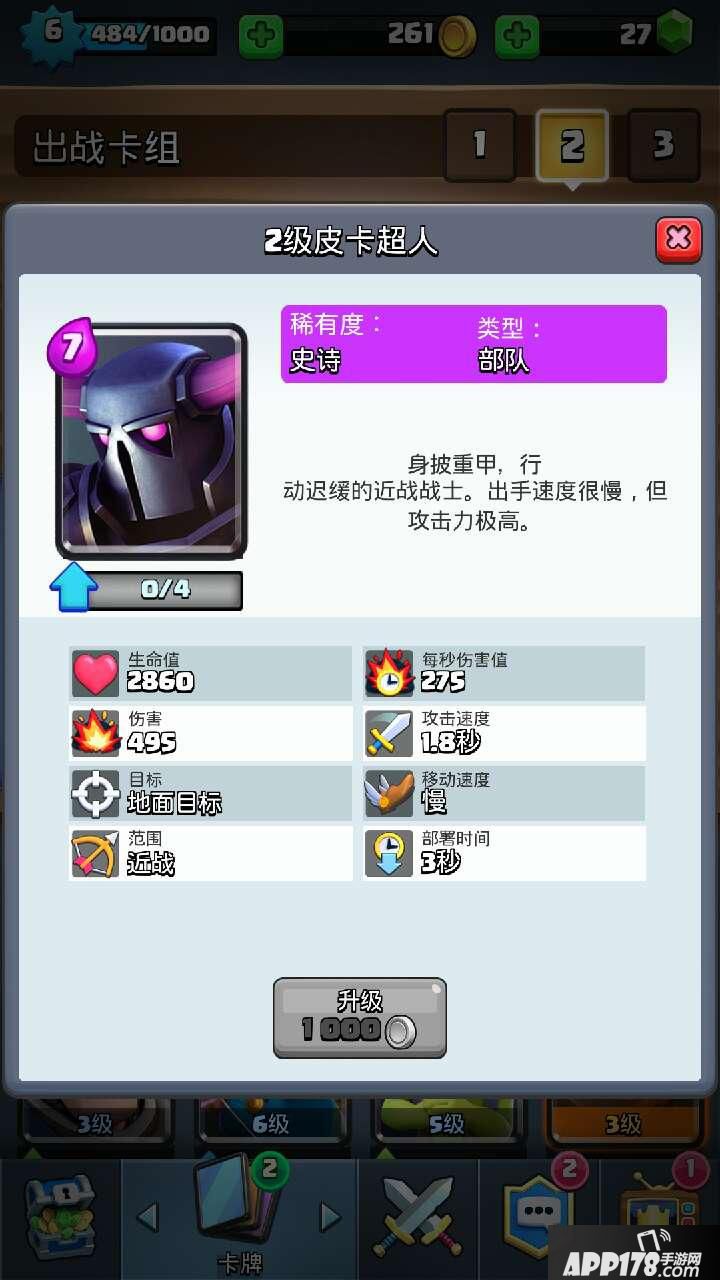 本卡组的核心是大皮卡,大皮卡攻高血厚,打王子胖子什么都是切菜,但是他的攻速很慢,所以遇上一些哥布林屌丝什么的很容易被玩死,而且跑的很慢,准备时间长