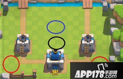 1.开局可以裸下,正确方法应该是等存满10费后再下。位置通常分两种前置和后置。前置可以如下图黑圈或者蓝圈处,好处是可以避免闪电或者导弹砸外加磨到箭塔,蓝圈为黄金防守位可以吸引两侧仇恨,在某些情况下是可以选择用于防守吸收伤害。后置可以保护采集器,安心发育,缺点惧怕导弹和闪电。