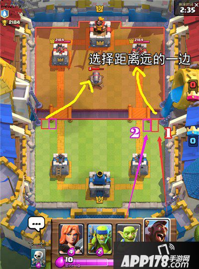如下图:将猪下在红框1号位,然后马上用哥布林等单位下在2号位卡住猪,猪就起跳了。