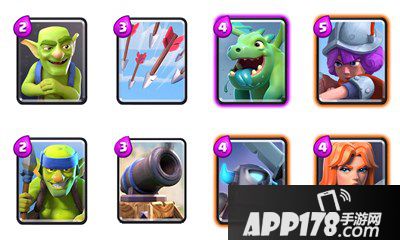 哥布林、哥布林投矛手、箭雨、加农炮、小皮卡、火枪手、女武神、飞龙宝宝