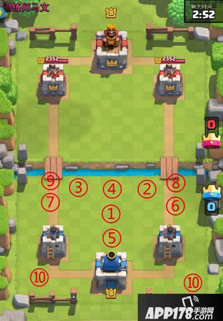 进攻建筑的放置位置,如【连弩】【迫击炮】。我们在这里可以最大程度的对敌方防御塔造成伤害。同时他们距离河岸的一侧我们可以布下防御,对于对方意图攻击我方防御建筑造成有效拦截。一般我们在河岸处防御放下【加农炮】【女武神】【骷髅兵】【哥布林组合】等低费同时可以阻拦对方的单卡。