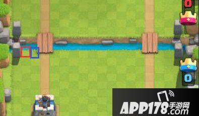 在你手上有这两张卡牌的时候,先放下猪,然后再迅速在你放猪的位置靠外一格放下另一个张卡,必须要快。若你在猪的放置时间没有结束之前放下了哥布林,那其中几个哥布林会把猪往旁边再挤一小格,这样的话你会看到你的猪直奔护卫塔。猪对应下图的红色框,另一张卡对应蓝色框,换到另一边就是镜像过去的位置。