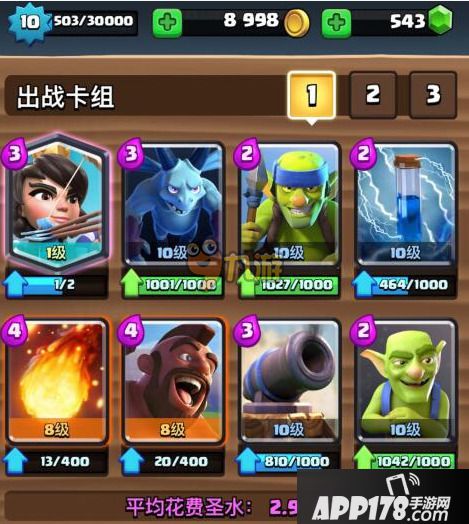 卡组搭配:公主+小苍蝇+哥布林投手+小闪电+火球+野猪+加农炮+刀哥