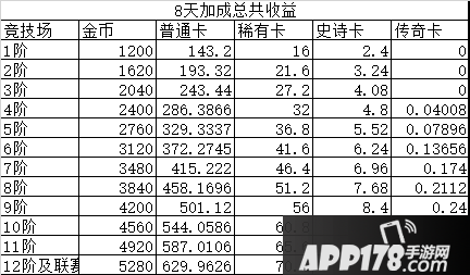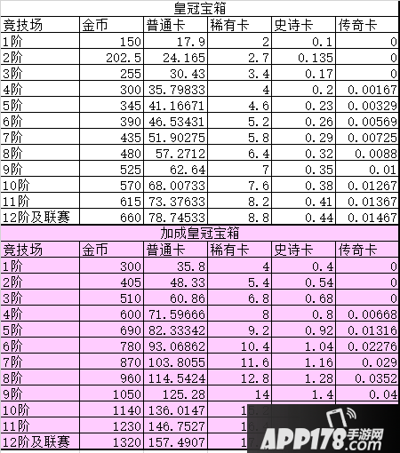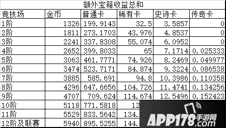 这个加成需要结合竞技场等级来看,如上图,可以发现,皇冠宝箱不仅仅是双倍加成,他对史诗、传奇卡的加成其实是4倍——虽然基数太低也就那么回事就是了。计算差价,卡出8天,减去基本的皇冠宝箱收益,可以得到大概这样一组数据: