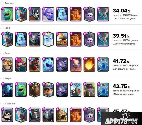 APP178手游网>皇室战争>游戏攻略>皇室战争主播挑战卡组胜率出炉 最垃圾的卡组是它