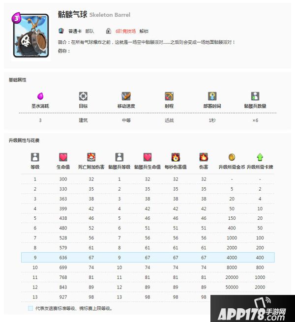 对战玩法:骷髅气球是一张我们在六阶竞技场中解锁的普通军队卡牌,费用消耗上为3点圣水,是一张轻低卡牌。这张卡在目前的对战中多是用于辅助骚扰为主,且玩法较为特殊。