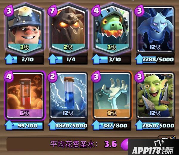 第二种是以‘掘地矿工’为核心,在这个玩法中会防守反击与消耗为主。在我们使用亡灵或者哥布林团伙解除了对手的进攻后,利用矿工的高血量拉扯到对手公主塔,后排的粉丝则能够造成更多输出。同时如果对手使用人海卡防守,我们可以搭配毒药或者小电解除来进行辅助消耗。