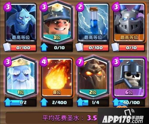 这套卡组均费3.5费,除了核心卡牌天狗需要消耗7点圣水外,其他卡牌基本以2-3费卡牌为主。