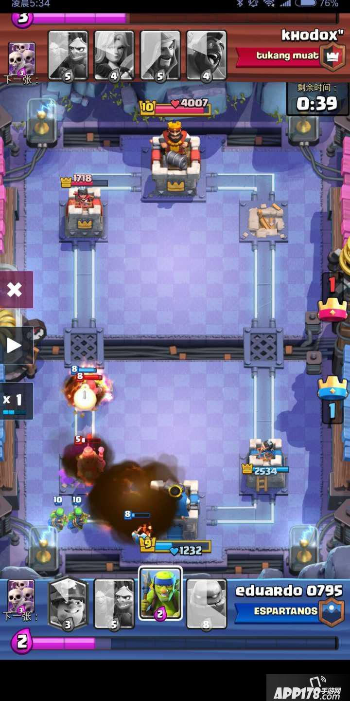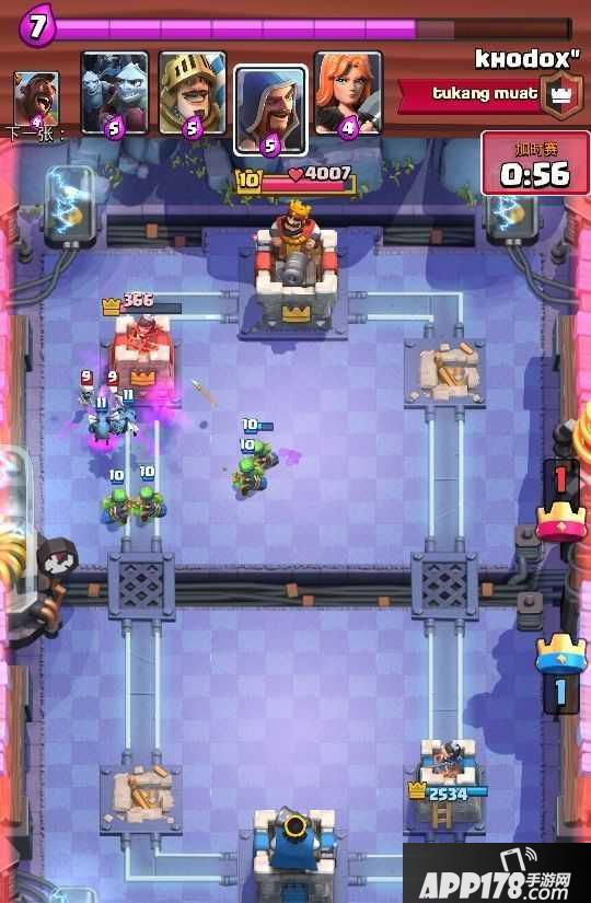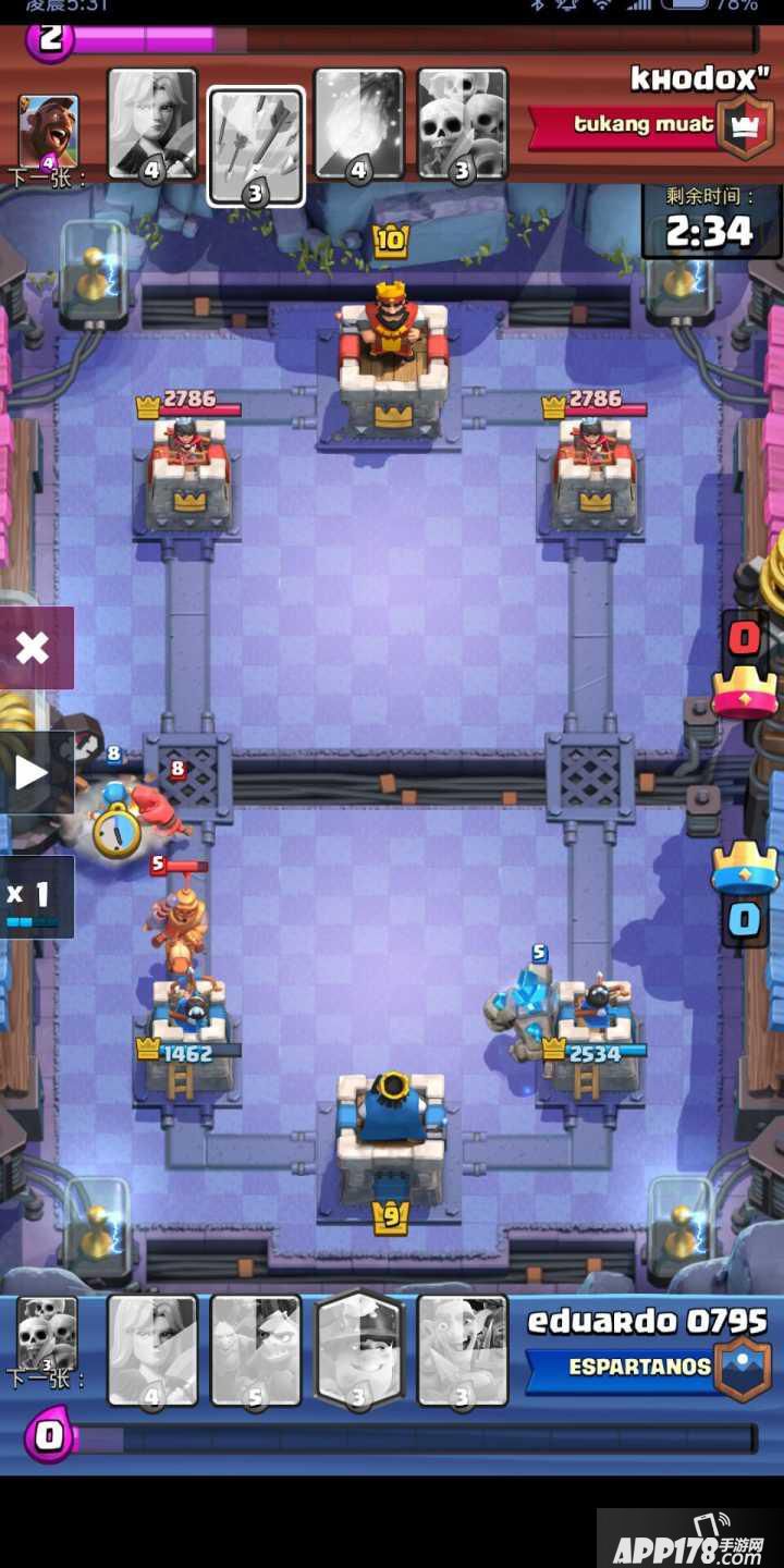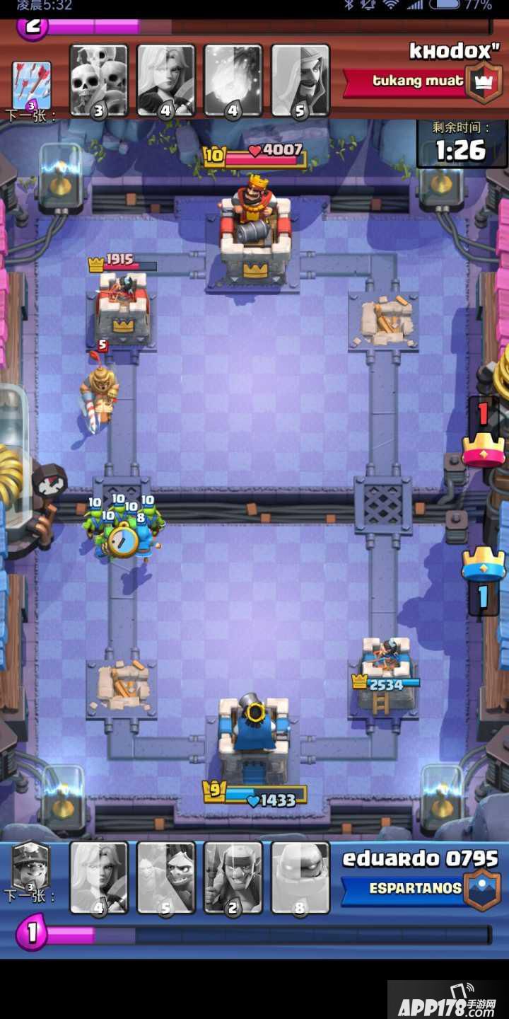 这里我根本没有进行防御,只是下了一个火法稍微抵挡一下,因为我十分自信我的卡组的进攻能力,只要石头人到了对面防御塔面前最次我也能推掉对面一个防御塔
