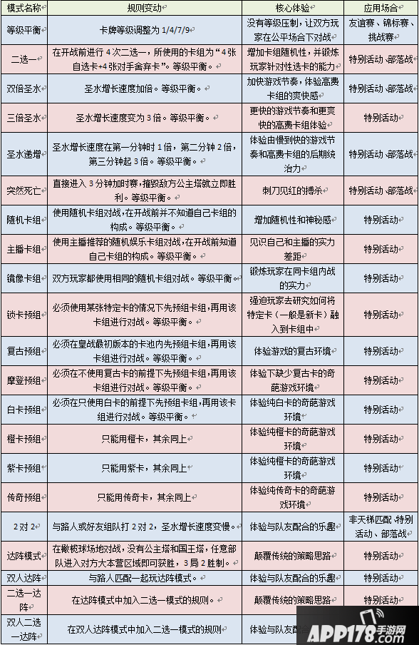 皇战在经典1V1对战这个核心规则基础上,进行了各种低成本的微调,衍生出了各种妙趣横生的新模式。这些新模式与经典1V1对战一起被应用在各种游戏活动中,在一定程度上解决了游戏的运营问题,提升了玩家对游戏的黏着度。具体的模式内容请参看下表: