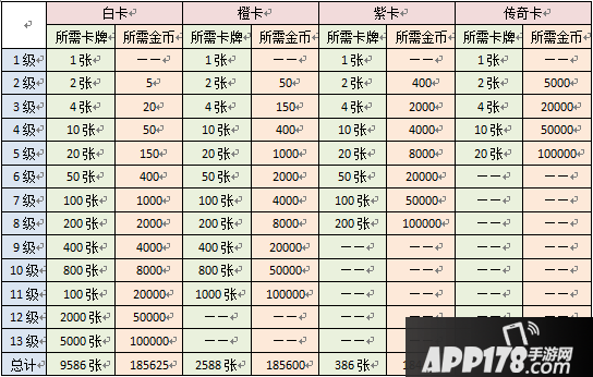 如Supercell的其它游戏一样,皇战也绝对是个深不见底的土豪游戏。我们做一个假设,如果玩家完全不在游戏里打钱,只是纯消费的话,那要花费多少钱呢?我们简单估算一下,商店中的卡牌售价分别为10、100、1000和40000(不考虑等待商店刷新的时间成本),那么如上表所示,玩家要获得满级的各色单张卡牌,所要耗费的金币为9586×10+185625=281485(白卡)、2588×100+185600=444400(橙卡)、386×1000+184400=570400(紫卡)、36×40000+175000=1615000(传奇卡),而目前游戏中的白卡为22张,橙卡为23张,紫卡为24张,传奇卡为15张,那么这些卡全部升满的话则需要5432万8470枚金币!按照游戏中648元购买14000宝石,而4500宝石可兑换10万金币的标准,每枚金币折合人民币0.00208元,那么玩家要纯靠财力去升满所有卡牌,就需要花费113158元!