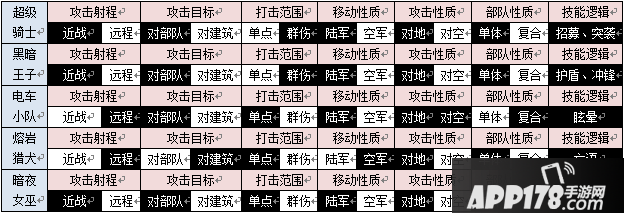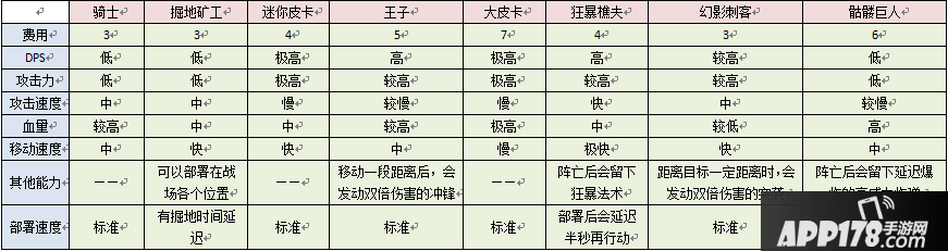 Supercell的设计师就像一流大厨那样,能同样的食材炒出来不同的味道。如下图所示,骑士、掘地矿工、王子等8个类型完全一样的兵种(对应参数都是近战、对部队、单点、陆军、对地、单体),设计师竟然能通过调整数值以及增加一些简单的技能,把它们营造出完全不同的感觉。