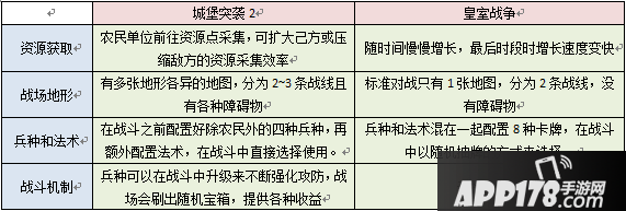 由上图对比可知,皇战对这个放置类推塔玩法的整体设计进行了大量删改,虽然《城堡突袭2》的这些设计看起来都十分有趣,但为了让游戏节奏变得更快,就不得不忍痛割爱。举例来说,很多战略游戏都喜欢围绕着“资源获取”这一点大做文章,让玩家一方面可以去把控本局游戏的发展思路(是舍弃发育打前期快攻,还是先发育再进攻),另一方面可以与其他玩家在资源上进行更多的交互(如与同盟玩家交易资源、与对手争夺资源点、打击补给线等等),游戏策略的多样性显然会大大增加。但对于移动端游戏来说,从资源这个角度去增加多样性,可能是得不偿失的行为,所以皇战就改成了“随时间慢慢增长”的方式,看似简单无脑,实则无比重要。