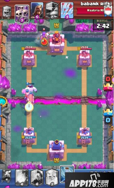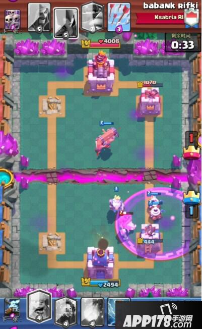 同时对方也毫不示弱,直接利用防守剩下的女巫配合超级骑士,随后再桥头野猪进攻。女巫的召唤效果也得到了强化,小骷髅的个数日益增多让我们防守十分吃力。同时野猪进场,这波我们处境十分危险。