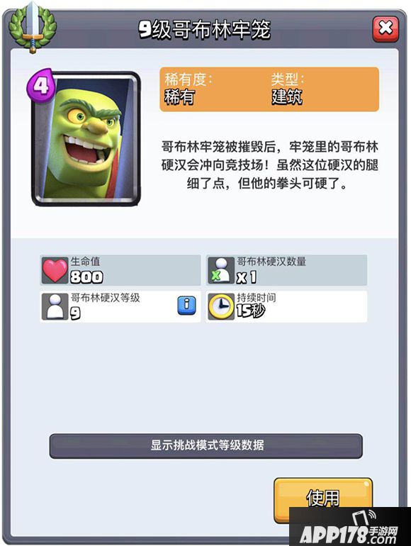 牢笼有800点血量,作为建筑物生命值比加农炮多,只要在正确位置摆放可以完美防住对手的野猪、攻城槌和羊骑。而释放出来的哥布林硬汉拥有853点的生命值和极快的移速,攻速和生命值与刺客近似,211的伤害和樵夫差不多。作为一张单体输出的近战单位,硬汉同样惧怕骷髅海、哥布林团伙等杂毛。