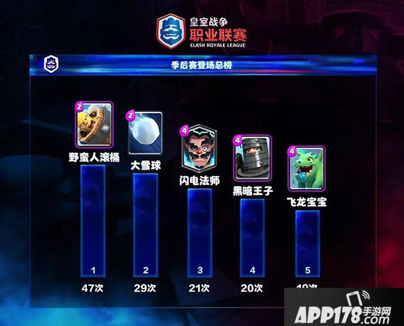 登场总榜,滚桶、雪球依旧强势,电法和黑骑保持上升势头,龙宝宝稳坐第5位。滚桶在这周的调整中已被削弱,总决赛中它还能有这般登场率吗?前5名外,小骷髅异军突起位列第6位(19次),机甲(17次)、毒药(17次)和刺客(15次)都是常规赛前5的常客。值得一提的是,季后赛登场榜前14位没有1张核心卡,大赛舞台,选手必须用更多不同的体系来避免针对。