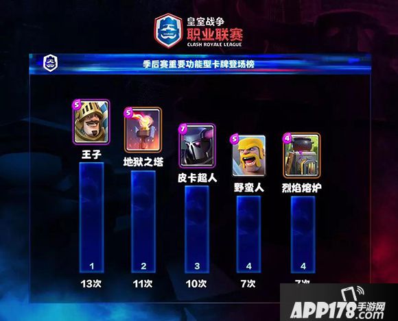 重要功能型卡牌榜单中,王子从常规赛一路统治到季后赛,地狱塔和皮卡超人均是处在上升周期,野蛮人和熔炉则均遭遇了下滑但仍能保持在前5位内。此外,绿林团伙(5次)和哥布林小屋(3次)则均是排名上升的典型。