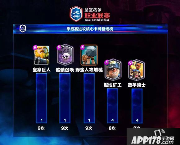 核心登场榜,在皇家巨人和攻城槌的夹击中,墓园强势崛起,这个9周常规赛仅登场了35次(核心倒数第6)的冷门核心,在季后赛3天就上了9次并列第一,各种墓园骚套路满天飞。矿工因为屡屡被BAN掉到第4,身后则是胜率超高的羊骑。除开前5外,野猪骑士(6次)和戈仑石人(6次)均有一席之地,地震猪到了季后赛开始渐成风潮。迫击炮(4次)、电磁炮(3次)和三枪(3次)则均是季后赛中为数不多的奇招。