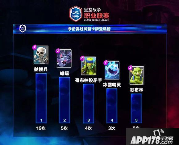 小费卡牌中,小骷髅在季后赛异军突起,不但抢走了蝙蝠的位置,出场次数更比2-5名加起来还多,这张1费卡牌能做的事情实在太多。蝙蝠、投矛手、冰精灵和刀哥紧随其后。