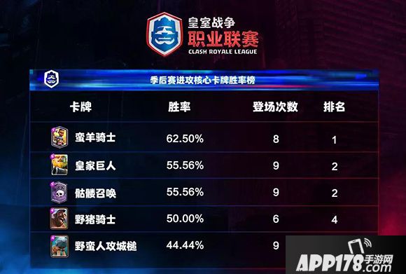 核心胜率榜,羊骑成为胜率第1核心,墓园则在登场(9次)和胜率(55.56%)双榜追上皇家巨人,蹦迪终于在季后赛迎来“美好时代”;地震猪让野猪的胜率刚好达标(50.00%),攻城槌尽管位居第5位,但胜率却只有44.44%。而常规赛的两大王者核心矿工(37.50%)和石头人(33.33%)都遭遇了胜率暴跌。一招鲜吃遍天?在CRL的赛场上可行不通。