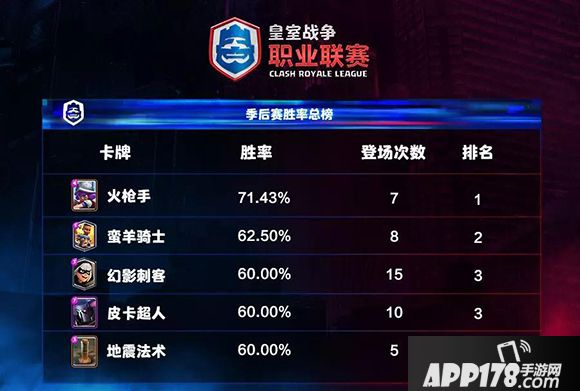 胜率总榜,防守神卡女枪以超7成的胜率打榜成功,单王一个残血女枪直接率领大军推3星的画面,堪称季后赛最精彩的瞬间之一。季后赛中最亮眼的核心当属羊骑,6成多的胜率让她一跃到榜眼,随后的刺客、皮卡和地震也都有6成的胜率。除前5外,飓风、小电车、和熔炉均是57.14%的胜率,同时皇家巨人和墓园(55.56%)也均能打出超5成的胜率。