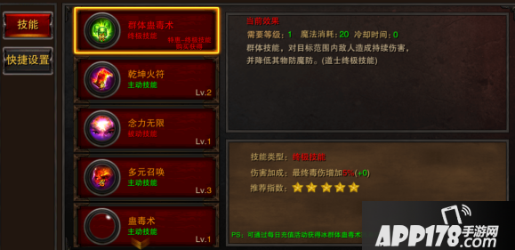 终极技能必须重点介绍这个就不用多说了,相比起战士和法师,道士的终极技能远比其他职业重要的多,原因只有一个——道士没群攻怎么练级啊……作为终极技能,群体蛊毒术不但弥补了道士没有群攻的缺憾,而且在PK、攻城等多人活动上面效果更是显著。这技能砍手也要入手!