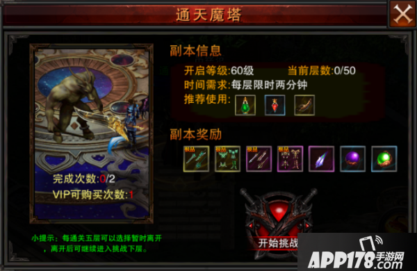 点击他后会出现下面的窗口,每层限时两分钟,不仅仅不能被小怪灭了,而且必须在限时内清完小怪进入下一关才行,这就意味着我们的输出必须要过硬才行。