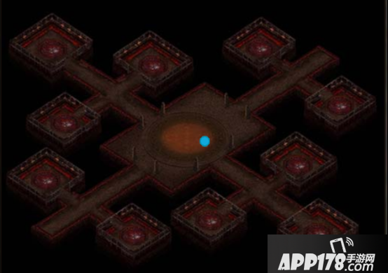 一进去,我们的位置就是蓝色点,可以看到除了中央的大厅以外,四个方向都有很多小房间,小房间里面住的就是Boss,此外无论是大厅还是走廊满满的都是小怪哦。