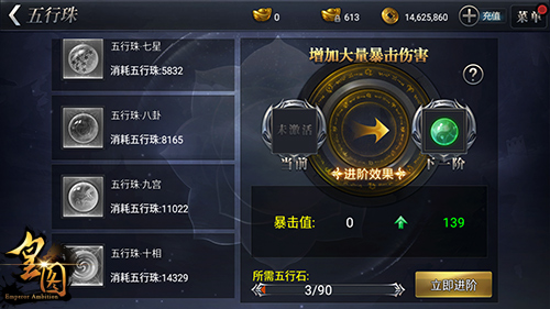 9377《皇图》当中的五行珠系统包括太初、两仪、三才、四象、五方、六合、七星、八卦、九宫、十相这十个等阶,可以为玩家们带来“暴击伤害”的单一属性的加成。而“暴击伤害”的提升,可以让玩家们在战斗当中的爆发一击对敌手造成更大的伤害,甚至可以秒杀敌人!
