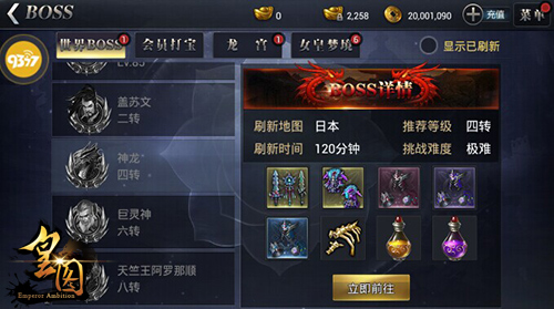 一战到底,怒爆BOSS!在《皇图》当中,黑衣大王、血手团宗主、神龙等世界BOSS以及引发“皇城危机”的邪恶女皇,其身上均携带着珍稀的附魔精华,因而受到了勇士们的围殴与争夺。而众多的高手强者都想分得一杯羹,自然会引发一番疯狂的血色混战!