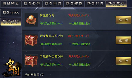 元宝道具免费兑换,帮会商店壕送福利!在本次新版本当中,《皇图》的帮会系统还新增了“帮会商店”玩法。帮会商店之中上架转生修为丹以及附魔精华宝箱(中)等元宝商店道具,勇士强者只要消耗一定的帮会贡献,便能够每日兑换到这些稀有道具!