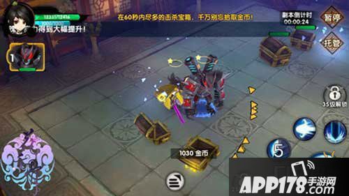 进入金库探宝副本大家可以看见副本中有许多的宝箱,控制好人物角色攻击宝箱,打爆箱子过后会爆出金币。金库探宝副本只有60秒的副本时间。因此,大家要在60秒的时间内,控制好人物角色尽可能打爆更多的箱子,进而拾取更多的金币。