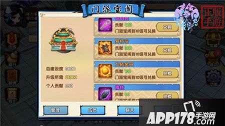 门派的发展壮大需要所有门派成员的共同努力,门派掌门用游戏货币升级门派可以提升建设度,而个人在门派里的相关捐献也是会得到个人贡献度的,贡献度在门派内的祈福殿是可以兑换各种福利的哟。 在门派宝阁内,玩家可以使用个人贡献兑换一定数量的道具,商城等级越高,可兑换的道具价值越高。各位童鞋若是想把自己的门派建设的更好,那就把门派所有成员号召起来吧,团结一心,将门派发扬光大!门派越壮大,可以获得的游戏福利也越豪华哟!