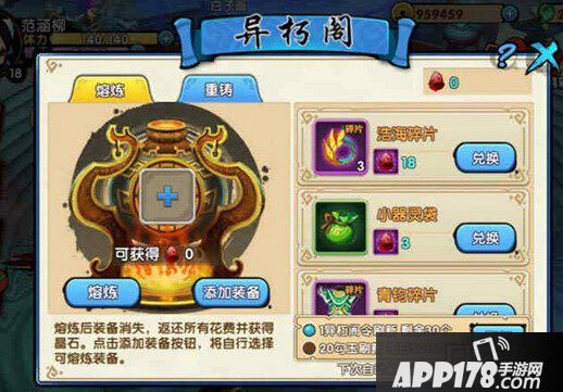 4、大家可以将紫色品质以上不用的装备放到异朽阁中进行熔炼,然后可以获得一定数量的血石,这个血石就可以兑换器灵。