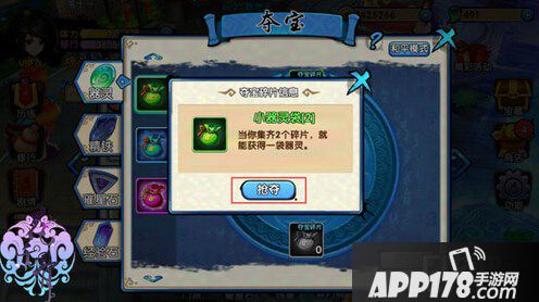 夺宝操作界面中间的图标代表所要抢夺的道具,可以点击图标查看这个道具的详细信息。在道具图标的周围,就是我们要抢夺的道具碎片。大家还要注意一点呢:已经获得的道具碎片的图标是彩色的,尚未获得的道具碎片的图标是黑白颜色的。大家可以选择需要的道具碎片,然后再点击碎片图标可以查看碎片的信息,并点击抢夺按钮。、