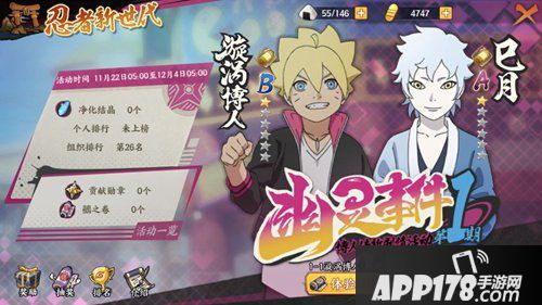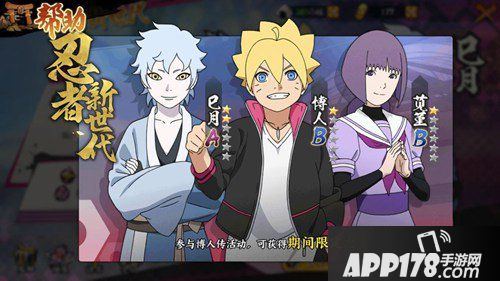 《火影忍者OL》手游获得火影忍者新世代篇章《博人传(Boruto)》的助力,游戏上线《博人传》专属副本,实现两代木叶忍者青春羁绊在游戏中的完整呈现!这次游戏开启忍者新时代活动,玩家累计登录即可领取B级忍者漩涡博人,参与体验博人传【限定】剧情通关可获得B级忍者笕堇碎片及A级忍者巳月碎片,玩家通过挑战boss获得抽奖券即可抽取A级忍者笕堇【鵺】。
