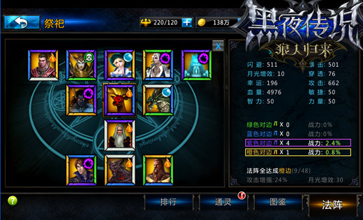 变强是成功的必经之路,在《黑夜传说之狼人归来》游戏中,战斗力是验证你的是否强大的标准,世界那么大,方法那么多,提升战力的机会当然也多种多样,祭祀法阵、符文、翅膀、魂兽、装备洗练、武器强化、武器附魔、技能、军衔、宝石、时装等等,不放过任何一个可以提升战力的机会!