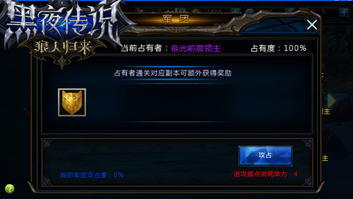每个军团的占有数是有限的,随着军团等级提升,占有数也会相应的增加。当玩家成功进击据点可以提升军团对据点的占有度,如果我方军团占有度高于据点占有者时,我方军团可以攻击占据,完成我方军团持有据点的对应副本可以获得额外奖励哦~另外,军团成员可以支援已方军团据点提升其占有度,如果你对所占领的据点不满意的话,也可以弃守,不过得让管理者才能执行。